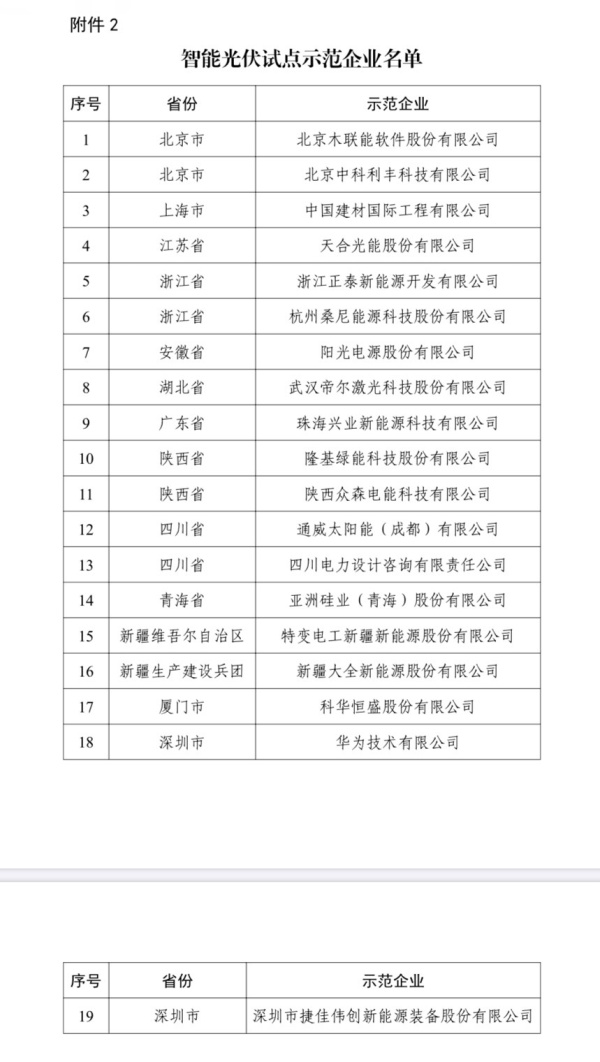 據(jù)工業(yè)和信息化部7月21日消息,為貫徹落實《智能光伏產(chǎn)業(yè)發(fā)展行動計劃(2018—2020年)》(工信部聯(lián)電子〔2018〕68號),經(jīng)省級有關(guān)部門推薦、專家評審、網(wǎng)上公示等程序,工業(yè)和信息化部、住房和城鄉(xiāng)建設(shè)部、交通運輸部、農(nóng)業(yè)農(nóng)村部、國家能源局、國務(wù)院扶貧辦將智能光伏試點示范項目和示范企業(yè)名單予以公告。
