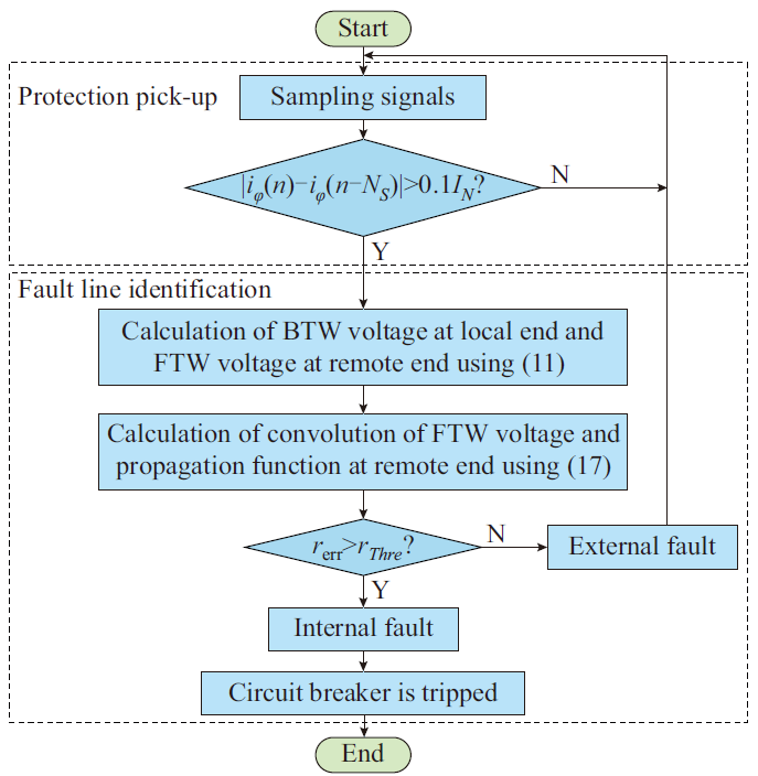 典型的換流器故障控制策略雖能弱化故障特征,但在故障暫態(tài)階段,故障特征主要受到海纜中電容和電感間能量交換的影響。同時(shí),換流器控制系統(tǒng)完成指定目標(biāo)需要一定時(shí)間,因此故障支路電流在故障暫態(tài)階段幅值較大并逐漸減小。充分利用該階段的故障信息,即可實(shí)現(xiàn)故障識(shí)別。鎧裝三芯海纜包含導(dǎo)芯、金屬屏蔽層和鎧裝,多導(dǎo)體之間存在電磁耦合,單獨(dú)分析相電氣量困難。對(duì)此,首先利用時(shí)域暫態(tài)信號(hào)相模變換,篩選出能夠反映各種故障類(lèi)型的模量。Marti模型考慮了線(xiàn)路頻變特性,能夠根據(jù)對(duì)端電壓前行波準(zhǔn)確計(jì)算本端電壓反行波。為了在低采樣率下實(shí)現(xiàn)計(jì)算,推導(dǎo)了基于插值的高精度電壓反行波電壓表達(dá)式。基于電壓反行波差異的海上風(fēng)電低頻輸電系統(tǒng)海纜縱聯(lián)保護(hù)方案流程圖如圖2所示。保護(hù)啟動(dòng)后,首先根據(jù)本端模量信息計(jì)算本端電壓反行波,然后通過(guò)對(duì)端電壓前行波與傳播函數(shù)間的卷積來(lái)計(jì)算本端電壓反行波,最終比較二者差異以實(shí)現(xiàn)海纜保護(hù)。