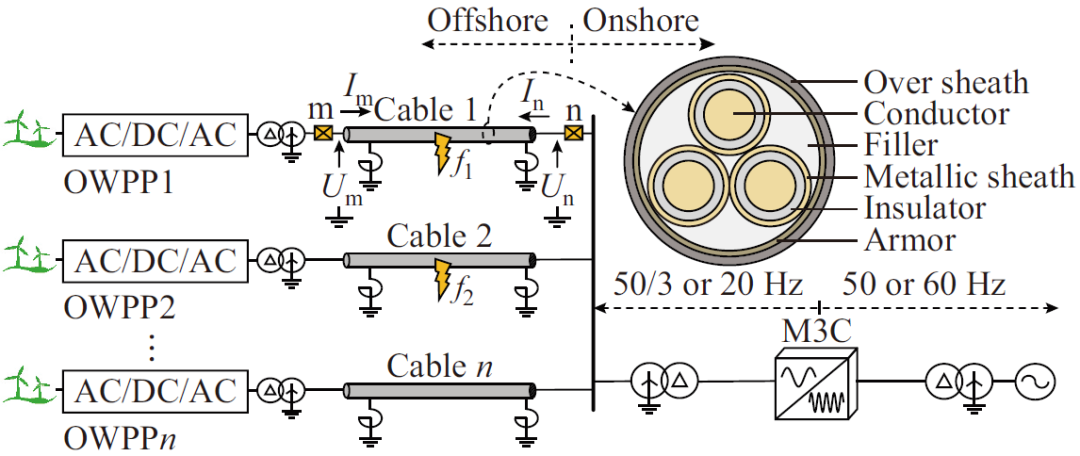 圖1給出了海上風(fēng)電低頻輸電系統(tǒng)拓?fù)洌@|需匯集來(lái)自于風(fēng)電場(chǎng)的電能,并經(jīng)模塊化多電平矩陣換流器(modular multilevel matrix converter,M3C)實(shí)現(xiàn)頻率轉(zhuǎn)換,從而在M3C低頻側(cè)構(gòu)成了100%電力電子源場(chǎng)景。相較于同步機(jī)系統(tǒng)在負(fù)序網(wǎng)絡(luò)中源側(cè)只體現(xiàn)阻抗特性,低頻輸電系統(tǒng)負(fù)序網(wǎng)絡(luò)中線(xiàn)路兩側(cè)均可體現(xiàn)為電源特性。根據(jù)單相接地故障和兩相相間故障復(fù)合序網(wǎng)圖,故障支路電流可由負(fù)序電流唯一確定,當(dāng)M3C和海上風(fēng)電場(chǎng)網(wǎng)側(cè)變流器(grid-side converter, GSC)抑制負(fù)序電流時(shí),盡管故障點(diǎn)處存在負(fù)序電壓源,但兩側(cè)換流器均會(huì)生成幅值相位相同的電壓源,以抵消系統(tǒng)中的負(fù)序電流,因此系統(tǒng)故障電流仍保持對(duì)稱(chēng),使得故障支路的穩(wěn)態(tài)電流為0。上述分析表明,雖然風(fēng)電場(chǎng)升壓變壓器和M3C低頻側(cè)隔離變壓器網(wǎng)側(cè)中性點(diǎn)均采取直接接地方式,但低頻輸電系統(tǒng)在特定故障控制策略下呈現(xiàn)出類(lèi)似于中性點(diǎn)非直接接地系統(tǒng)的故障特征。