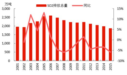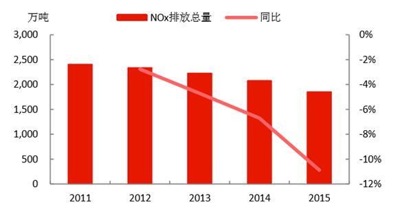 經(jīng)過“十二五”的治理,四項污染物減排約束性指標均實現(xiàn)了持續(xù)下降,完成了“十二五”的減排任務,取得了一定的環(huán)保成果。2015年:1)COD的排放量為2224萬噸,且每年以3%左右的速度下降;2)氨氮的排放量為230萬噸,且每年以3%左右的速度下降;3)SO2的排放量為1859萬噸,每年基本以4%左右的速度下降,而收關年2015年下降速度高達5.84%;4)NOx的排放量為1852萬噸,“十二五”剛開始治理,當前的下降速度還處于上升趨勢,收關年2015年下降速度高達10.89%。