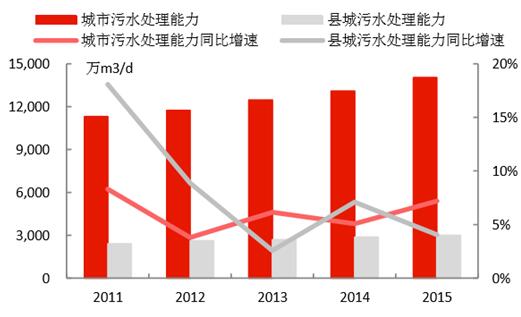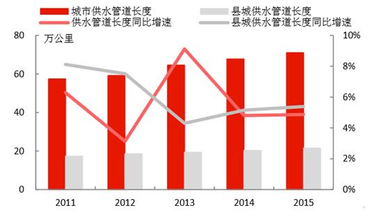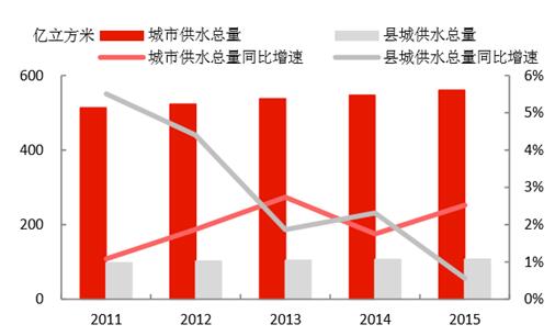 城鎮(zhèn)化的推進,為水務行業(yè)持續(xù)帶來增量空間。1)我國城鎮(zhèn)人口2015年達到7.71億,近年城鎮(zhèn)人口增速維持在3%左右;城市建成區(qū)面積2015年達到5.21萬平方公里,近年面積增速維持在4-5%。2)城市供水總量在2015年達到561億立方米,同比增速為2.5%;縣城的供水量達106.9億立方米,增速有所下降,僅為0.56%。3)城市供水管網(wǎng)長度在2015年達到71.0萬公里,同比增速為4.87%;縣城的供水管網(wǎng)長度為21.5萬公里,同比增速達5.39%;通過管網(wǎng)建設,是的用水普及率持續(xù)提升,城市和縣城2015年的用水普及率分別為98.1%和90.0%。4)城市污水處理能力在2015年達到1.40億立方米/日,同比增長7.19%;縣城達到2999萬立方米/日,同比增長了4.06%,城市和縣城的污水處理率分別達到91.9%和85.2%,較2010年分別提升了9.6和25.1個百分點。