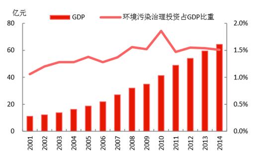 從國家統(tǒng)計局的數(shù)據(jù)可以看到,我國在環(huán)境污染治理方面的投資量,呈現(xiàn)上升趨勢,2014年達到9576億元;近年占GPD的比重維持在1.5%左右,較2001年提升約0.5個百分點。發(fā)改委、環(huán)保部印發(fā)《關于培育環(huán)境治理和生態(tài)保護市場主體的意見》,提出目標,“十三五”綠色環(huán)保產(chǎn)業(yè)產(chǎn)值年均增長15%以上,遠高于CDP的增長目標,為經(jīng)濟增長注入動力。