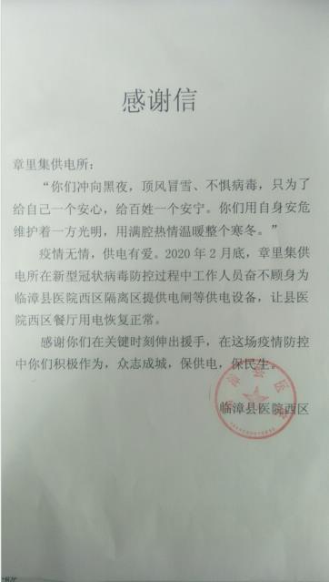 章里集供電所所長(zhǎng)吳超接過(guò)重量雖輕卻又意義非凡的感謝信后激動(dòng)地說(shuō):“謝謝你們對(duì)我們工作的肯定,疫情戰(zhàn)場(chǎng)上,是你們白衣天使沖鋒在前。作為國(guó)家電網(wǎng)人,我們更要發(fā)揚(yáng)頂?shù)蒙?、靠得住、打得贏得電力鐵軍精神,攜手打贏這場(chǎng)沒(méi)有硝煙的戰(zhàn)疫!”