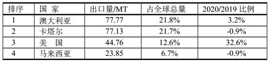 2020年LNG生產(chǎn)國(guó)共計(jì)出口356.12MT,2020年LNG出口最多的前4位國(guó)家如表。表明最大出口國(guó)是澳大利亞和卡塔爾,但增幅美國(guó)最大。