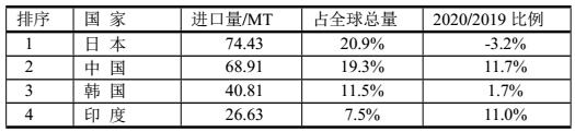 2020年全球LNG進(jìn)口量達(dá)356.12 MT。LNG進(jìn)口最多的前4位國(guó)家如表,表明仍然是日本LNG進(jìn)口量最多,但中國(guó)LNG進(jìn)口增幅最大的。
