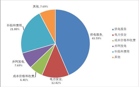 按業(yè)務(wù)類別分類:供電服務(wù)類34件,占43.59%;電力安全類10件,占12.82%;成本價(jià)格和收費(fèi)類5件,占6.41%;并網(wǎng)發(fā)電類6件,占7.69%;補(bǔ)貼和費(fèi)用類17件,占21.80%;其他類6件,占7.69%。