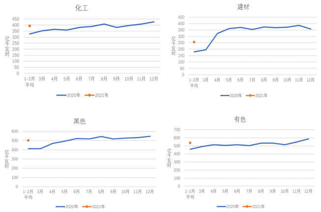1-2月,化工行業(yè)用電量790億千瓦時,同比增長14.3%,增速比上年同期提高22.1個百分點(diǎn);建材行業(yè)用電量512億千瓦時,同比增長39.4%,增速比上年同期提高57.8個百分點(diǎn);黑色金屬冶煉行業(yè)用電量1006億千瓦時,同比增長18.8%,增速比上年同期提高21.6個百分點(diǎn);有色金屬冶煉行業(yè)用電量1074億千瓦時,同比增長12.7%,增速比上年同期提高13.9個百分點(diǎn)。