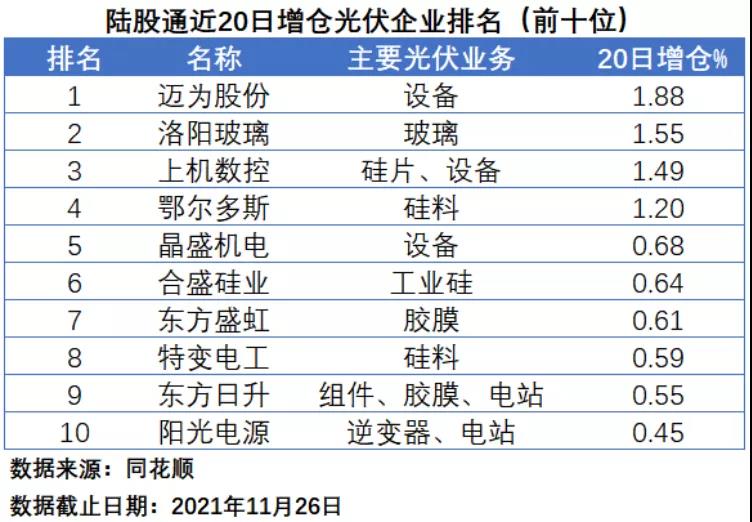 在陸股通近20日增倉排名中,邁為股份、洛陽玻璃和上機數(shù)控位居前三位,增持幅度分別為1.88%、1.55%和1.45%,值得一提的是,洛陽玻璃于11月26日正式發(fā)布了產(chǎn)能擴建計劃,未來公司在光伏玻璃領(lǐng)域的市場地位將進一步得到鞏固;上機數(shù)控此前三季報業(yè)績不及預(yù)期,股價大跌,而“北向資金”則選擇了逆勢抄底。排名第四到第十位的企業(yè)分別為鄂爾多斯、晶盛機電、合盛硅業(yè)、東方盛虹、特變電工、東方日升和陽光電源。