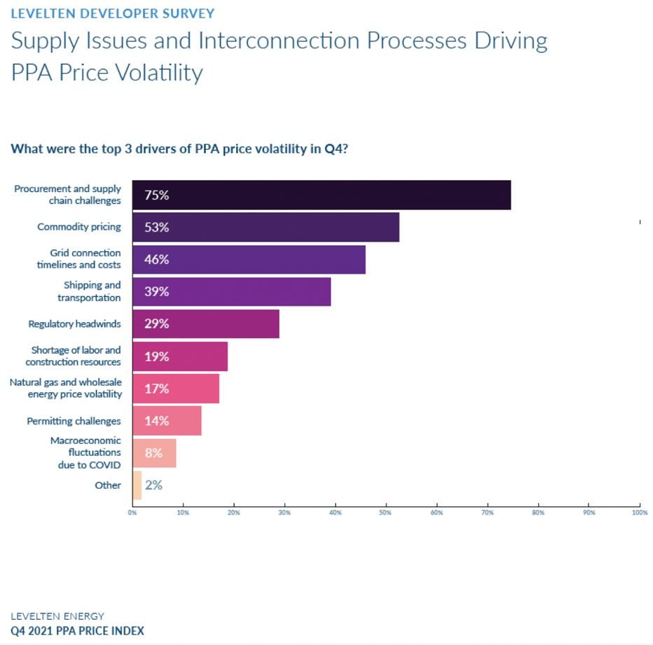 上述創(chuàng)紀(jì)錄的太陽能光伏的采購是在光伏成本上升的情況下發(fā)生的。LevelTen Energy的一項(xiàng)調(diào)查表明,由于需求增加、宏觀經(jīng)濟(jì)波動(dòng)、供應(yīng)鏈問題以及其他因素的影響,光伏成本從 2020 年初開始上漲。據(jù)LevelTen Energy 的最新報(bào)告, 2021 年第四季度購電協(xié)議( PPA) 價(jià)格指數(shù)顯示光伏價(jià)格上漲了 5.7%,達(dá)到34.25 美元/兆瓦時(shí)。
