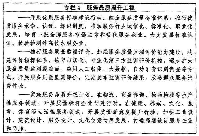 (七)提高產(chǎn)業(yè)質(zhì)量競爭水平。推動產(chǎn)業(yè)質(zhì)量升級,加強(qiáng)產(chǎn)業(yè)鏈全面質(zhì)量管理,著力提升關(guān)鍵環(huán)節(jié)、關(guān)鍵領(lǐng)域質(zhì)量管控水平。開展對標(biāo)達(dá)標(biāo)提升行動,以先進(jìn)標(biāo)準(zhǔn)助推傳統(tǒng)產(chǎn)業(yè)提質(zhì)增效和新興產(chǎn)業(yè)高起點發(fā)展。推進(jìn)農(nóng)業(yè)品種培優(yōu)、品質(zhì)提升、品牌打造和標(biāo)準(zhǔn)化生產(chǎn),全面提升農(nóng)業(yè)生產(chǎn)質(zhì)量效益。加快傳統(tǒng)制造業(yè)技術(shù)迭代和質(zhì)量升級,強(qiáng)化戰(zhàn)略性新興產(chǎn)業(yè)技術(shù)、質(zhì)量、管理協(xié)同創(chuàng)新,培育壯大質(zhì)量競爭型產(chǎn)業(yè),推動制造業(yè)高端化、智能化、綠色化發(fā)展,大力發(fā)展服務(wù)型制造。加快培育服務(wù)業(yè)新業(yè)態(tài)新模式,以質(zhì)量創(chuàng)新促進(jìn)服務(wù)場景再造、業(yè)務(wù)再造、管理再造,推動生產(chǎn)性服務(wù)業(yè)向?qū)I(yè)化和價值鏈高端延伸,推動生活性服務(wù)業(yè)向高品質(zhì)和多樣化升級。完善服務(wù)業(yè)質(zhì)量標(biāo)準(zhǔn),加強(qiáng)服務(wù)業(yè)質(zhì)量監(jiān)測,優(yōu)化服務(wù)業(yè)市場環(huán)境。加快大數(shù)據(jù)、網(wǎng)絡(luò)、人工智能等新技術(shù)的深度應(yīng)用,促進(jìn)現(xiàn)代服務(wù)業(yè)與先進(jìn)制造業(yè)、現(xiàn)代農(nóng)業(yè)融合發(fā)展。
