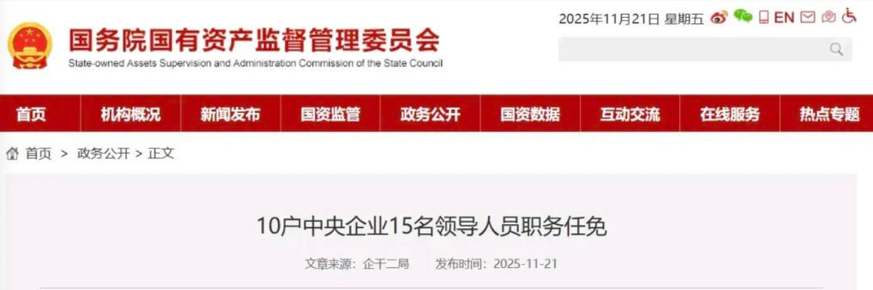 國務(wù)院國資委網(wǎng)站11月21日消息,10戶中央企業(yè)15名領(lǐng)導(dǎo)人員職務(wù)任免。