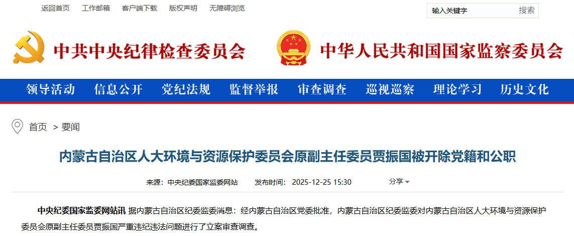 內(nèi)蒙古自治區(qū)人大環(huán)境與資源保護(hù)委員會原副主任委員賈振國被開除黨籍和公職