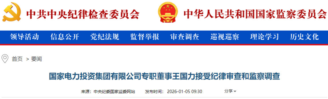 國家電力投資集團(tuán)有限公司專職董事王國力接受紀(jì)律審查和監(jiān)察調(diào)查